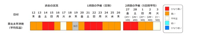 東北地方の向こう2週間の気温は、暖かい空気に覆われやすいため高い日が多く、2月21日頃からはかなり高くなる見込みです。農作物の管理等に注意してください。積雪の多い地域ではなだれに注意してください。また、今後の気象情報等に留意してください。