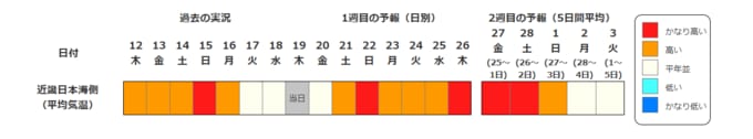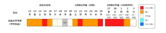 近畿地方の向こう2週間の気温は、暖かい空気に覆われやすいため高い日が多く、2月22日頃と25日頃からはかなり高くなる見込みです。農作物の管理等に注意してください。積雪の多い地域ではなだれに注意してください。また、今後の気象情報等に留意してください。