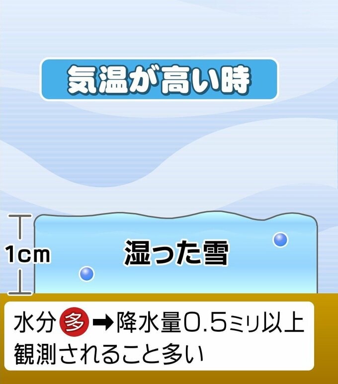 「雪も積もれば水にならない!?」降雪量1センチなのに”降水量0ミリ”の謎 32日連続降水量0ミリ記録の仙台 東北放送 2026年2月19日(木) 16:41 国内 気温が高い中で雪が降ると 一方、例えば比較的気温が高い中で降る湿った雪は、空気が少なく水分が多いため、今回と同じ1センチの降雪量でも降水量が観測されるかもしれません。