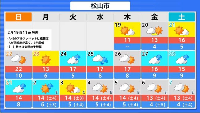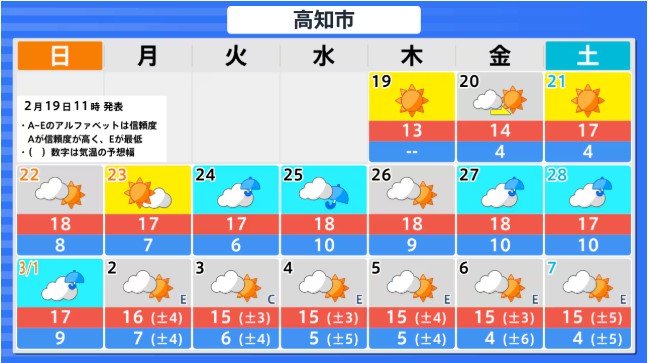 四国地方の向こう2週間の気温は、暖かい空気に覆われやすいため高い日が多く、2月22日頃と25日頃からはかなり高くなる見込みです。農作物の管理等に注意してください。