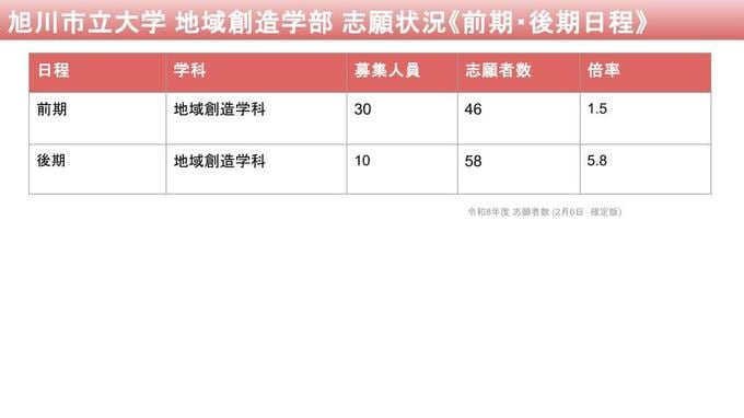 旭川市立大学 志願状況2026【確定】保健看護学科の中期26.7倍 経済学部の後期13.3倍 北海道放送 2026年2月19日(木) 16:50 国内 旭川市立大学 地域創造学部 倍率は前期1.5倍、後期5.8倍 地域創造学科は、前期日程で、30人の募集に対し46人が出願していて、1.5倍になっています。 後期日程で、10人の募集に対し58人が出願していて、5.8倍になっています。