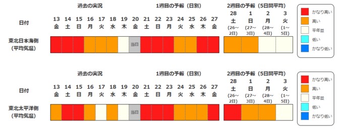 東北地方の向こう2週間の気温は、暖かい空気に覆われやすいため高い日が多く、2月21日頃からはかなり高くなる見込みです。