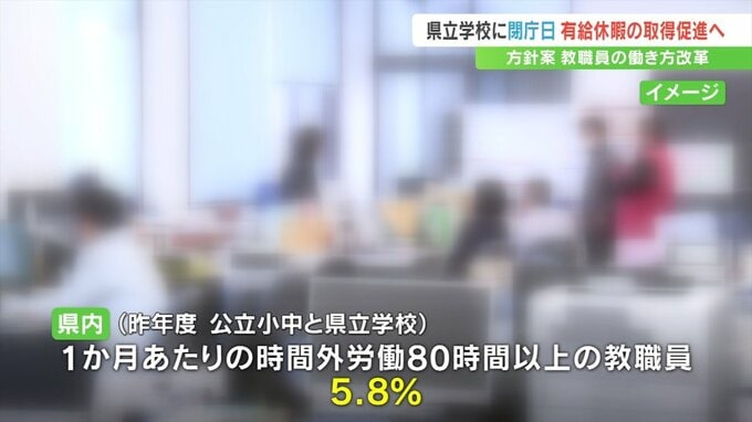 県教委によりますと、昨年度 県内の公立小中学校と県立学校で1か月あたりの時間外労働が80時間を超えた教職員の割合は5.8%となっています。