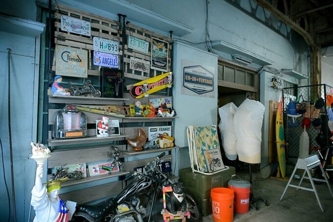 映像では目立たない部分にも、チョークアート教室の看板や介護用品店の段ボールなどが置かれている。たまに映り込む表の看板には、シェアしている店舗名が連なり、空間にリアリティを与えている。