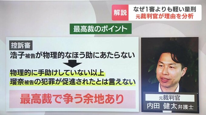 控訴審でも浩子被告が物理的なほう助に当たらないと認められています。浩子被告が物理的に手助けしていない以上、瑠奈被告の犯罪が促進されたとは言えないとして、弁護側には最高裁で争う余地があると見ています。