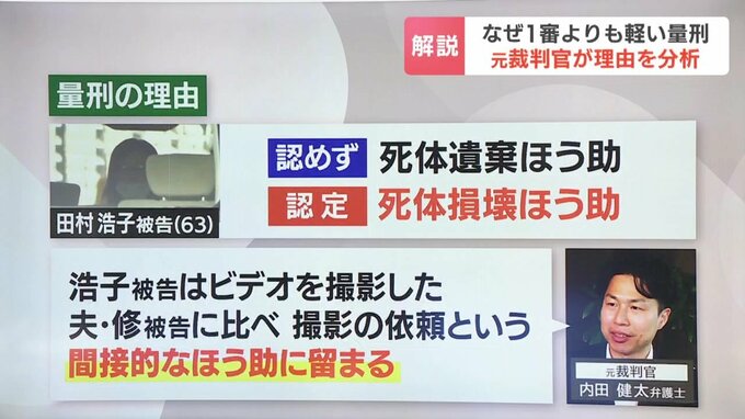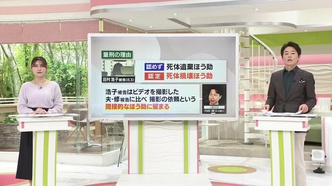 「死体損壊のほう助」については認定したものの、瑠奈被告が頭部を損壊する様子をビデオで撮影した夫の修被告に比べ、浩子被告は「撮影の依頼」という間接的なほう助に留まるとされ、刑が軽くなりました。