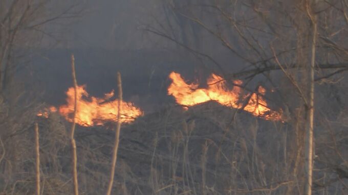 枯れ草が広い範囲で燃えていて、消防車10台と県の防災ヘリ1機が出動し消火活動にあたっていますが、現在も延焼中だということです。