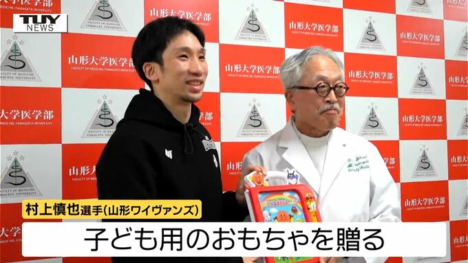 3回目となる今年は、およそ90万円の寄付金と共に、活動に賛同した山形ワイヴァンズの村上慎也選手が、子ども用のおもちゃを寄贈しました。