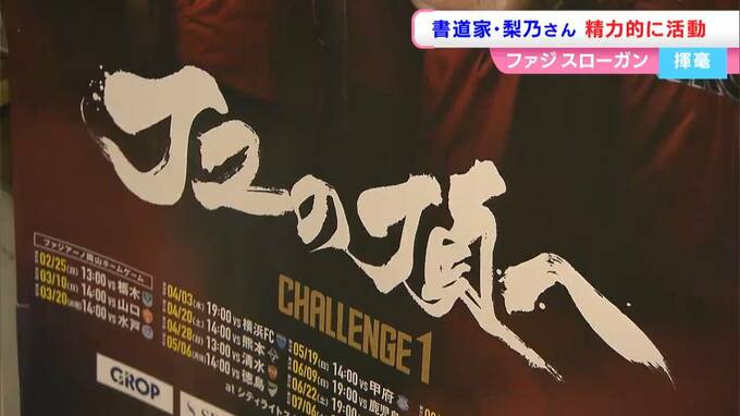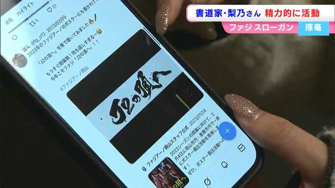 梨乃さんに光があたるようになったきっかけは、ファジアーノ岡山の、スローガンです。J1昇格前の2023年から2期にわたって揮毫を手がけました。