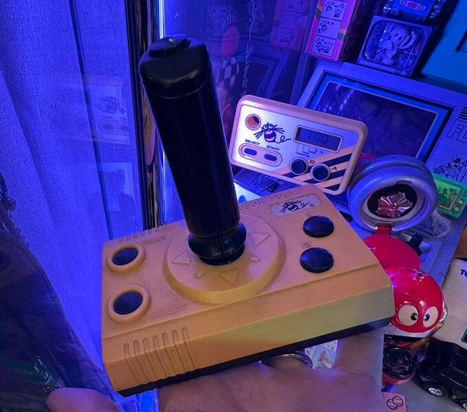キャラクターポスターが壁一面を彩る室内。テーブルの上には、任天堂のファミリーコンピュータなどのレトロゲーム機が現役で稼働している様子が伺えます。