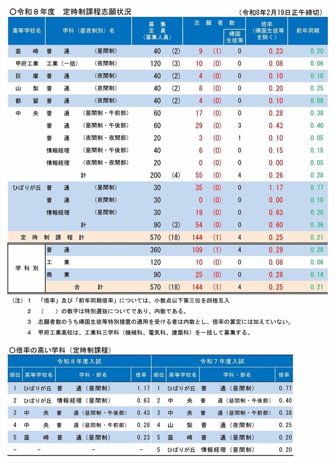 【山梨県公立高校入試・後期試験 倍率一覧】全日制の全体倍率は0.9倍 2007年度以降で最低を更新 最高倍率は青洲・商業科の1.38倍 テレビ山梨 2026年2月19日(木) 18:10 国内 定時制課程志願状況