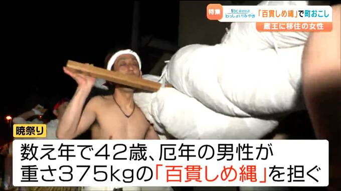 60年以上続くこの祭りでは、数え年で42歳、厄年の男性が重さ375キロの「百貫しめ縄」を担ぎ町内を練り歩きます。