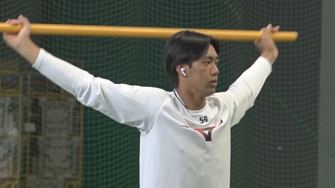 午前10時半、コザしんきんスタジアムに隣接する屋内練習場にバットを手にやってきた西川。マシンを相手におよそ30分間打撃練習に打ち込みました。