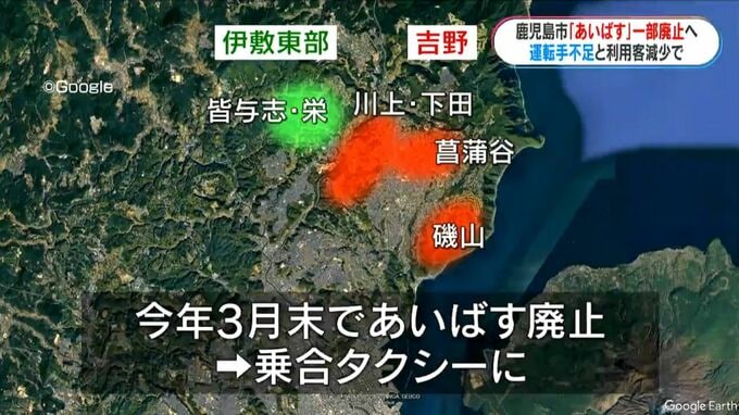 このうち、▼吉野地域の川上・下田、菖蒲谷、磯山エリアと、▼伊敷東部地域の皆与志・栄エリアについて、今年3月末で「あいばす」を廃止し、代わりに乗合タクシーを運行する方針となりました。