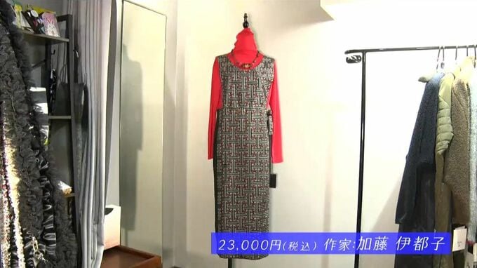 奄美大島を中心につくられる「大島紬」を仕立て直したジャンパースカートに、現在では希少という龍郷柄のベストなどの洋服から、帽子や雑貨まで並んでいます。