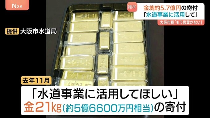 「水道事業に活用してほしい」。大阪市に寄付されたのは、およそ5億7000万円相当の金の延べ棒でした。大阪市 横山英幸 市長「とんでもない金額で、なんというか、もう言葉がないわけですよ」大阪市によりますと…