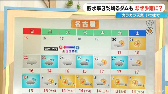 少雨はいつまで?長引く水不足…貯水率3%を切るダムも 来週は“恵の雨”に期待 最新の雨シミュレーション CBCテレビ 2026年2月19日(木) 20:44 国内 来週は“恵の雨”が…? 名古屋の16日間先までの予報を見てみると、来週は断続的に雨は降りそうです。 その後、再び雨の少ない状況にはなるとは思いますが、これまでと状況は変わってきます。