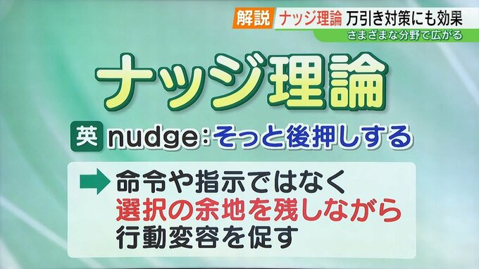 「ナッジ理論」を活用した万引き対策の実証実験です。ナッジ理論では「万引きをしないでください」と強制するのではなく、聞いた人が自発的に万引きをしないように行動を促します。
