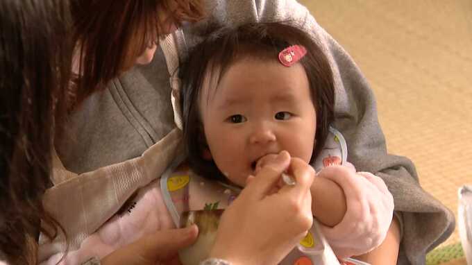 赤ちゃんも親も、体を動かしてリラックスした後は、いよいよ離乳食の時間です。