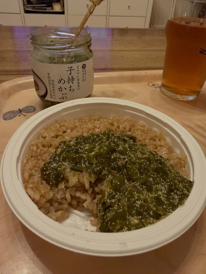 さらに、赤と白のコントラストも印象的な丸い蒸し器の写真で「551の豚まんのあっためるやつかわいい」と紹介。そして、丸い容器の中に詰まった玄米に乗せた海藻らしき食べ物について「伊達さんからいただいたこもちめかぶが美味しくてご飯にかけてかきこんでいる!」と、お笑いコンビ「サンドウィッチマン」の伊達みきおさんからの「子持ちめかぶ」を紹介しています。