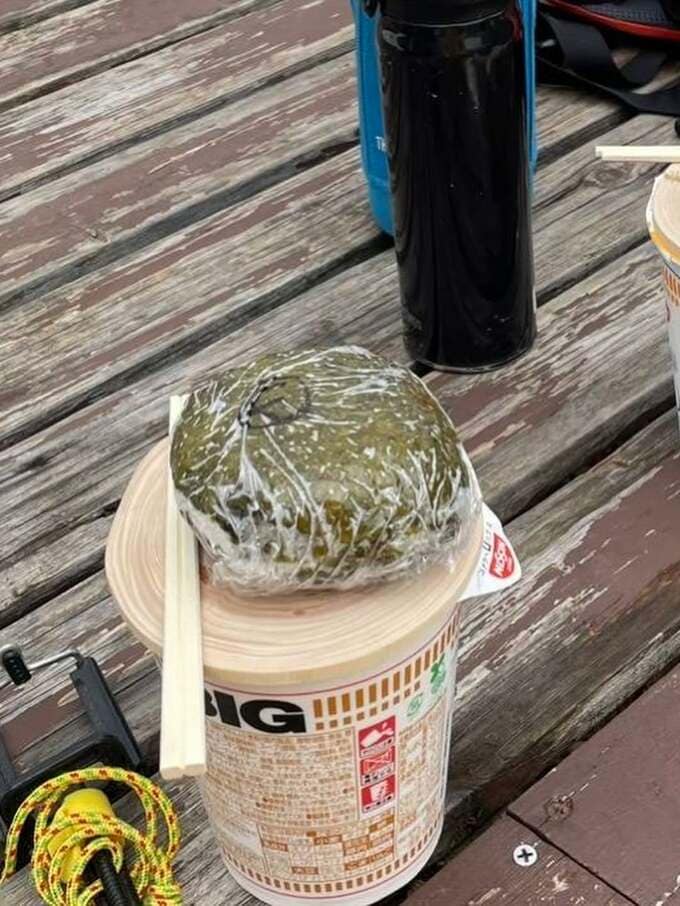 そして5枚目に「トマトピーマン味噌汁」を投稿。6枚目にはフタの上におにぎりを載せられたカップラーメンの写真が。井上さんはそれを「登山に行く母から送られてきた写真」「まさか父の作ったコースターでカップラーメンのフタをおさえてる…?」と説明していて、良く見るとおにぎりとカップラーメンのフタの間には年輪模様の入った丸くて薄い木の板のようなものが挟まっています。見るからにちょうど良いサイズで、これが井上さんの父による手製のコースターだと思われます。