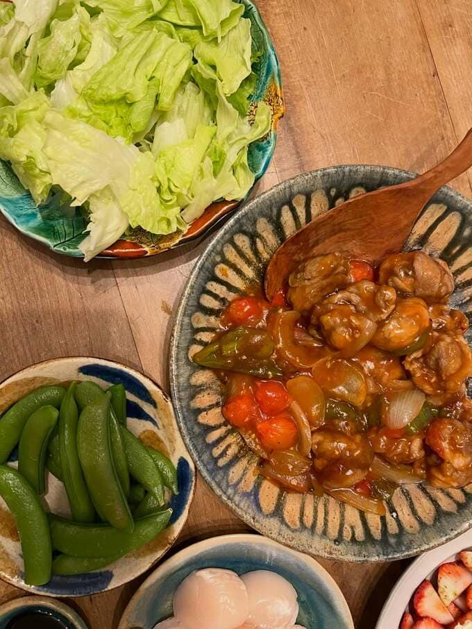 井上さんは1枚目に、大皿の酢豚・レタス・サヤエンドウなどが並んだ食卓の写真を投稿。2枚目には調理中の写真を投稿していて「酢豚つくりました!豚こまでコロコロ」とのこと。四角く切ったカタマリ状の豚肉ではなく、よりお手頃な豚肉の「こま切れ」で酢豚を作るという、井上さんの工夫が披露されています。