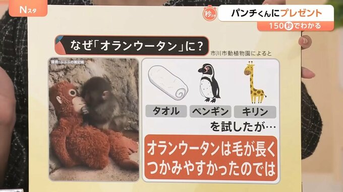 市川市動植物園によると、パンチくんの“お母さん代わり”としてオラウータンの前に、様々なぬいぐるみを試していたといいます。