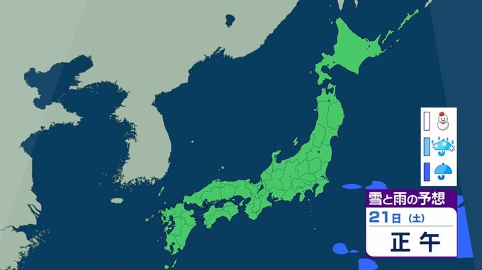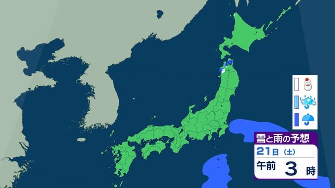 北海道以外は”真っ赤”…東北・関東甲信・北陸・東海・近畿・中国・四国・九州北部・九州南部・沖縄 “10年に一度レベル”の高温の可能性 2月25日ごろから 気象庁が「早期天候情報」発表 チューリップテレビ 2026年2月19日(木) 21:19 21日(土)の雪と雨のシミュレーション