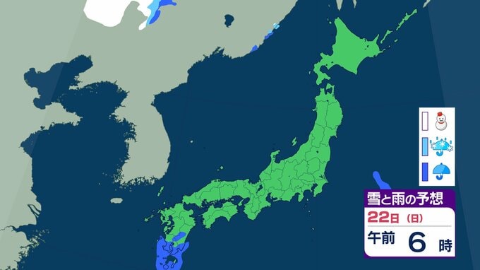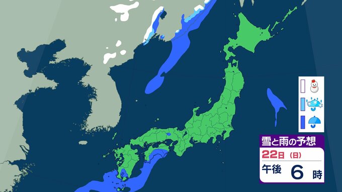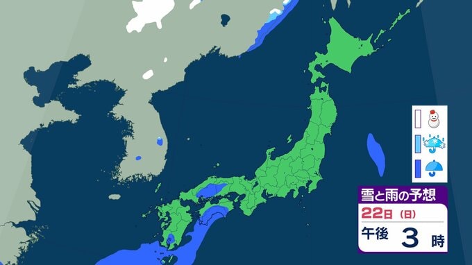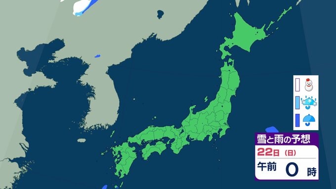 北海道以外は”真っ赤”…東北・関東甲信・北陸・東海・近畿・中国・四国・九州北部・九州南部・沖縄 “10年に一度レベル”の高温の可能性 2月25日ごろから 気象庁が「早期天候情報」発表 チューリップテレビ 2026年2月19日(木) 21:19 22日(日)の雪と雨のシミュレーション