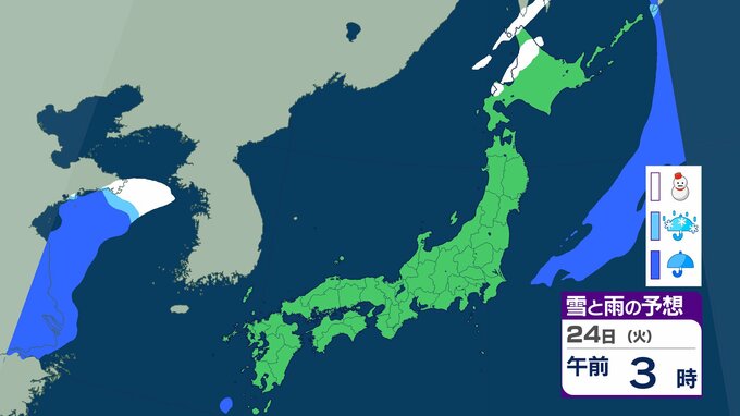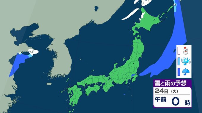 北海道以外は”真っ赤”…東北・関東甲信・北陸・東海・近畿・中国・四国・九州北部・九州南部・沖縄 “10年に一度レベル”の高温の可能性 2月25日ごろから 気象庁が「早期天候情報」発表 チューリップテレビ 2026年2月19日(木) 21:19 24日(火)の雪と雨のシミュレーション