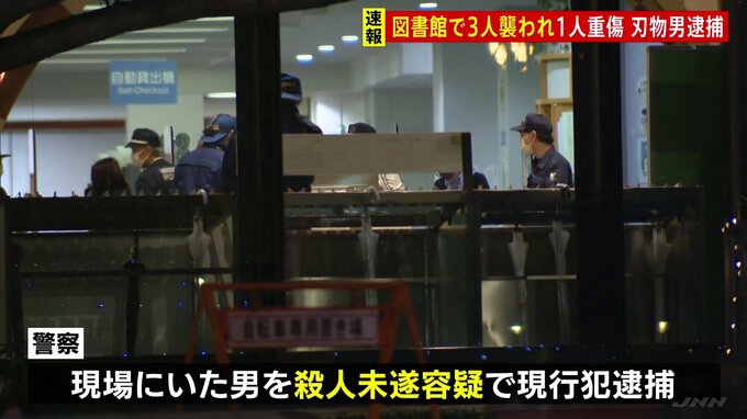 きょう夜、福岡市早良区の図書館で成人の男女3人が刃物を持った男に襲われました。警察は男を殺人未遂の疑いで現行犯逮捕しました。記者「現場は多くの人が利用する図書館の中で、現在は入り口に規制線が敷かれ、…