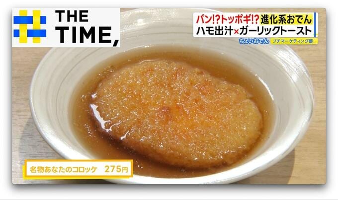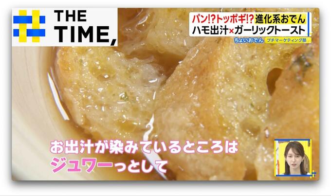 厚さ1cmほどにスライスされたバゲットを、熱したガーリックバターに浸し、高級魚「ハモ」を使った濃厚な出汁をかけた“変わりおでん”。