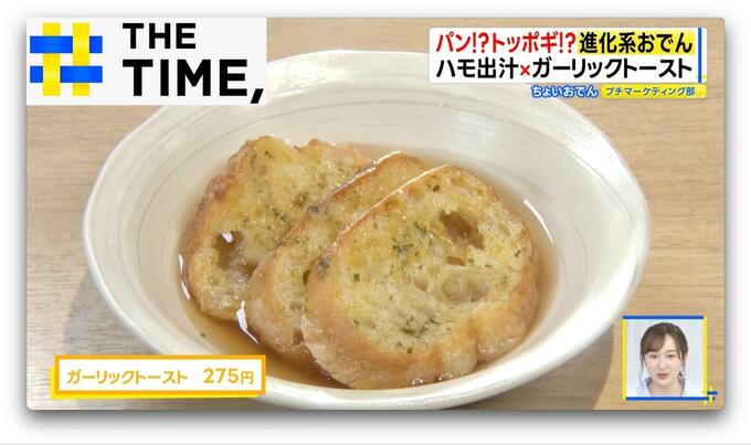 ほろほろに煮込んだ「牛タン」や、出汁をたっぷりかけた「コロッケ」など、変わったおでんが楽しめると人気ですが、中でも名物となっているのが「ガーリックトースト」(275円)です。