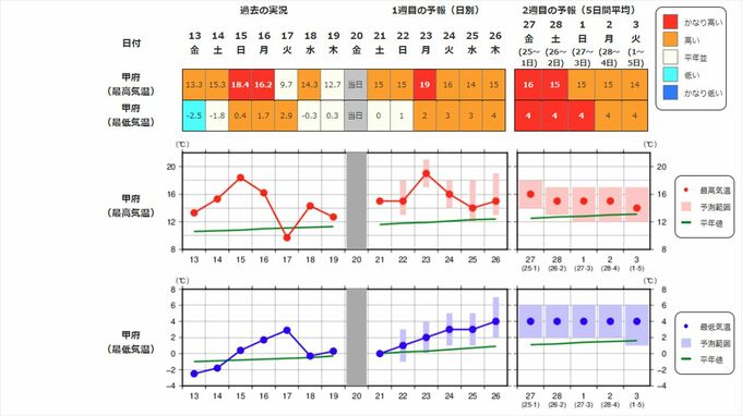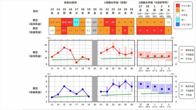 関東甲信地方の向こう2週間の気温は、暖かい空気に覆われやすいため高い日が多く、2月22日頃からはかなり高くなる見込みです。