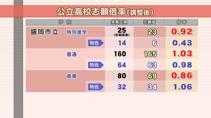 岩手県公立高校入試2026志願倍率(調整後) 盛岡一1.22倍、盛岡三1.26倍 【全校掲載】 IBC岩手放送 2026年2月20日(金) 16:35 国内 盛岡市立高校 調整後の志願倍率 ▷【記事はこちらから】1ページ目の記事に戻る 地区別の倍率はこちらから 【地区別で見る】盛岡地区 【地区別で見る】中部地区 【地区別で見る】県南地区 【地区別で見る】沿岸南部地区 【地区別で見る】宮古地区 【地区別で見る】県北地区 【倍率を見る】県立高校定時制 【倍率を見る】盛岡市立高校