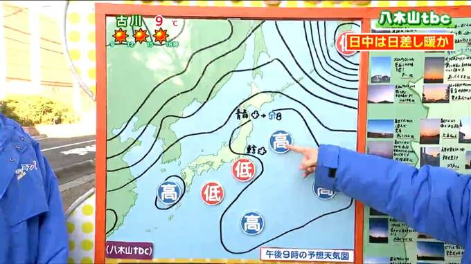 20日はこの後も高気圧に覆われて、宮城県内は1日よく晴れる見込みです。風も穏やかとなるでしょう。東京では低気圧の影響で雲が多く、青森では湿った空気の影響で夕方から雨や雪が降るなど、20日は宮城県のあたりが全国で最もよく晴れそうです。