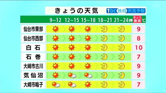 ■石巻:7℃ ■大崎市古川:9℃ ■気仙沼:9℃