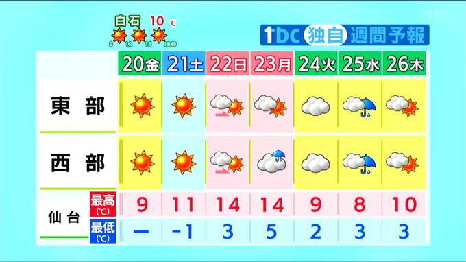 【20日宮城の天気】全国で最もよく晴れる 3連休は春先取りの暖かさも花粉飛散が本格化のおそれ tbc気象台 東北放送 2026年2月20日(金) 11:02 国内 週間予報 来週火曜日以降はこれまでに比べると雲が広がりやすくなります。水曜日は低気圧の影響でまとまった雨となる可能性があります。 来週火曜日以降も気温は平年より高い日が多くなるでしょう。