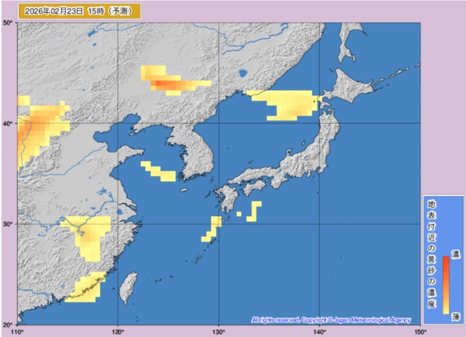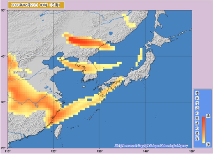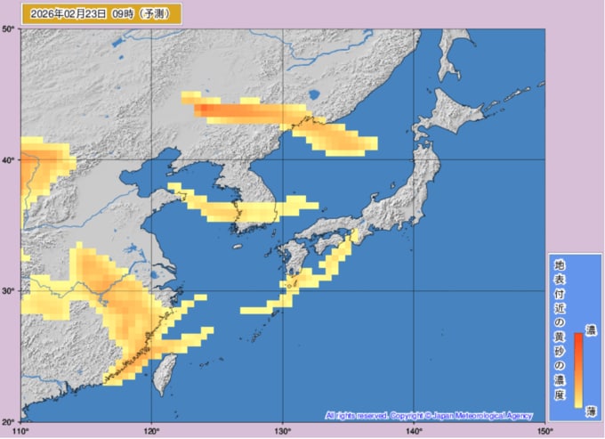 【黄砂情報】22日、23日は西日本に黄砂飛来か...2月22日~2月23日の黄砂シミュレーション いつどこに、どれくらい飛んでくる? 黄砂を上空から見たデータで確認 気象庁発表 テレビユー山形 2026年2月20日(金) 11:07 国内 ■黄砂はいつ・どこに飛んでくる?(23日) ※画像は気象庁より