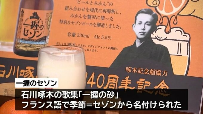 啄木の歌集「一握の砂」とフランス語で季節という意味のセゾンから名づけられたこのビールは、ラガーのすっきり感とミカンの風味が特徴です。