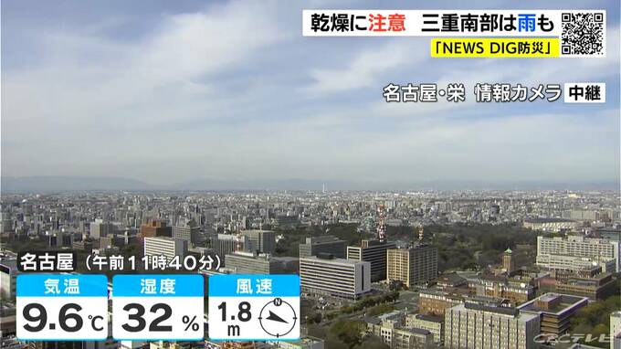 きょうの午後は、晴れ間の広がる所が多いでしょう。愛知県や岐阜県を中心に、空気の乾燥が続く見込みです。三重県南部では、夕方にかけてパラパラと雨の降る所があるでしょう。
