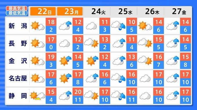 北陸地方の向こう2週間の気温は、暖かい空気に覆われやすいため高い日が多く、2月22日頃と25日頃からはかなり高くなる見込みです。