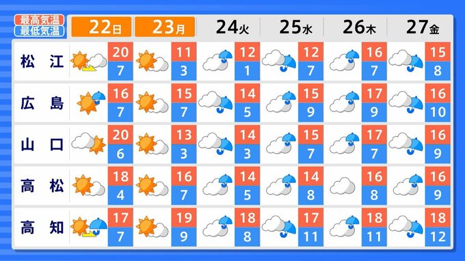 中国地方の向こう2週間の気温は、暖かい空気に覆われやすいため高い日が多く、2月22日頃と25日頃からはかなり高くなる見込みです。