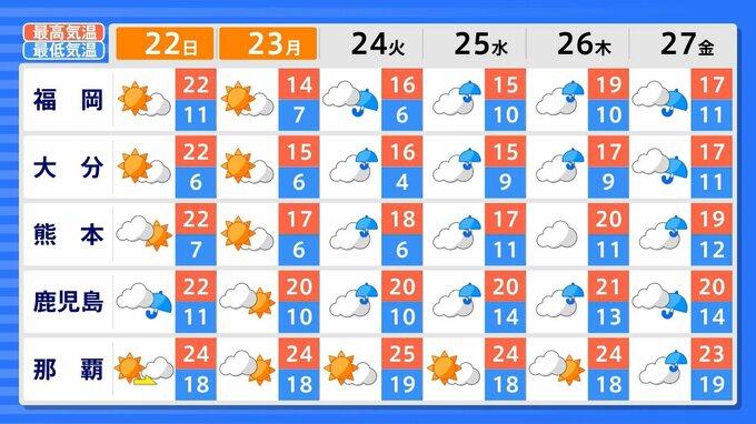 九州北部地方(山口県を含む)の向こう2週間の気温は、暖かい空気に覆われやすいため高い日が多く、2月22日頃と25日頃からはかなり高くなる見込みです。