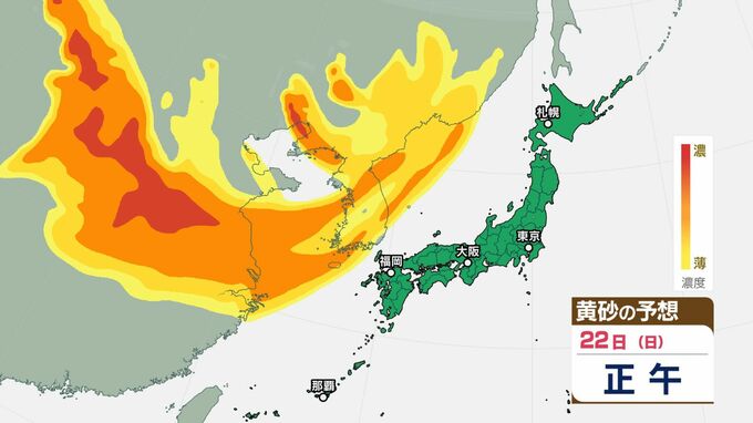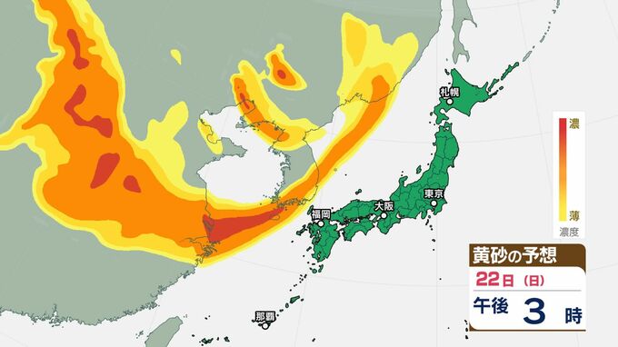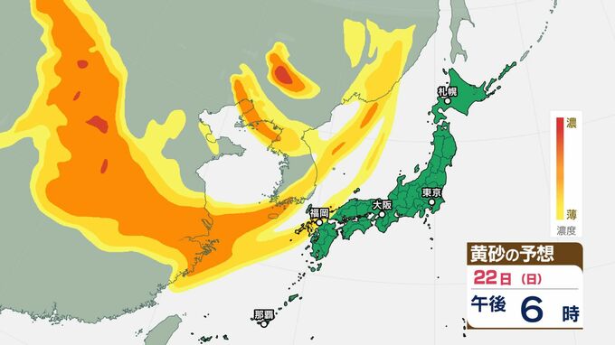 【黄砂情報】黄砂が日本列島に飛来か 九州、中国、四国など西日本の広い範囲で影響の可能性 黄砂はいつ、どこに?【気象庁黄砂シミュレーション/20日更新】 RSK山陽放送 2026年2月20日(金) 13:00 国内 天気 22日(日)午後 22日(日)~23日(月)黄砂シミュレーション 22日(日)~23日(月)黄砂シミュレーション