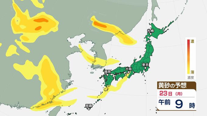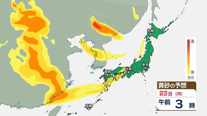 【黄砂情報】黄砂が日本列島に飛来か 九州、中国、四国など西日本の広い範囲で影響の可能性 黄砂はいつ、どこに?【気象庁黄砂シミュレーション/20日更新】 RSK山陽放送 2026年2月20日(金) 13:00 国内 天気 23日(月)午前 22日(日)~23日(月)黄砂シミュレーション 22日(日)~23日(月)黄砂シミュレーション