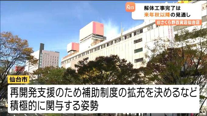 旧さくら野百貨店仙台店を巡っては土地と建物の大部分を保有する会社が跡地の再開発を白紙とし、建物解体後の土地利用が未定となっています。仙台市は再開発の支援のため、補助制度の拡充を決めるなど、積極的に関与していく姿勢を示しています。