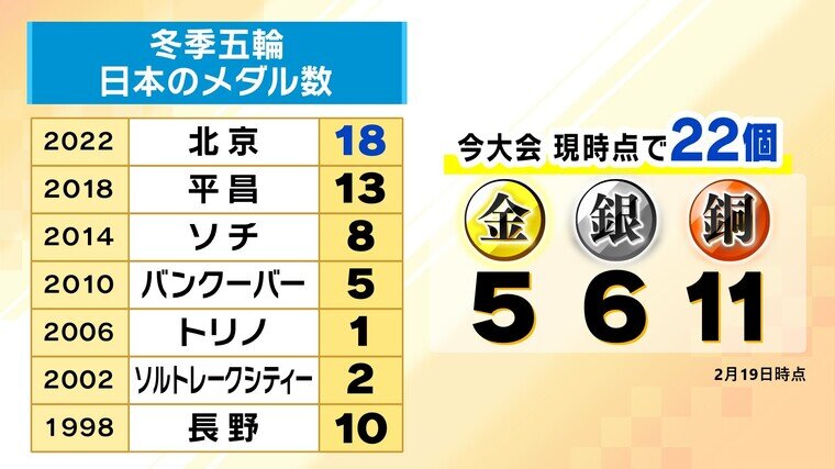 過去の冬季五輪を振り返ると、1998年の長野大会では10個、そこから20年間はメダル獲得数1ケタの時代が続きますが、2018年の平昌では13個、2022年の北京では18個と近年『増加傾向』にあります。