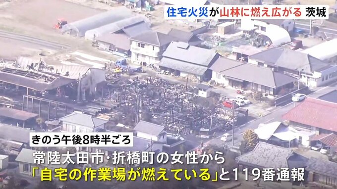 きのう午後8時半ごろ、常陸太田市・折橋町に住む女性から「自宅の作業場が燃えている」と119番通報がありました。火は住宅など7棟を焼き、消し止められたものの、住宅火災は近くの山林に燃え広がり、現在も延焼中です。