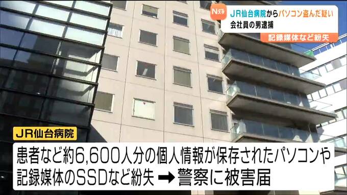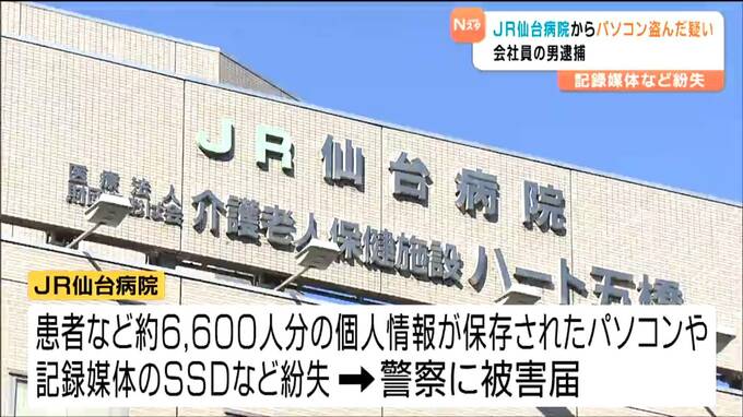 男は空調機器を管理する会社に勤めていて、JR仙台病院にも業務で出入りしていたということです。JR仙台病院は患者など約6600人分の個人情報が保存されたパソコンや記録媒体のSSDなどが紛失していて2月16日、警察に被害届を提出していました。